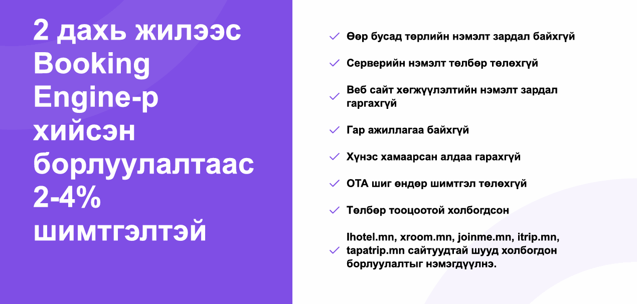 Зочид буудлынхаа вэбсайт болон Facebook хуудсаар дамжуулан шууд захиалга авч, OTA-д төлдөг 15-20%-ийн шимтгэлийг хэмнээрэй.